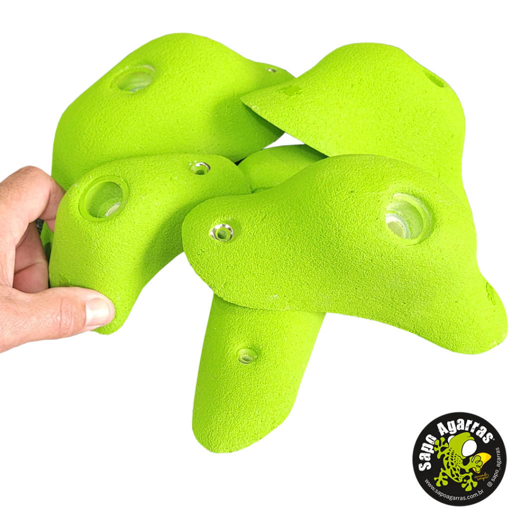 Agarras com pegadas de pinça de mão cheia e com a característica de serem gordas. Este set foi projetado para atender a **todo tipo de público**, do **iniciante ao avançado**, oferecendo um desafio único na força de compressão e pegada. Perfeito para diversos tipos de vias e inclinações.